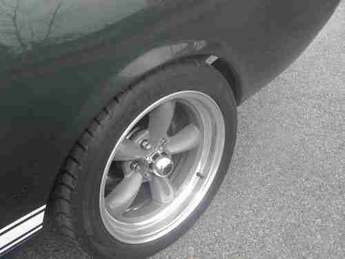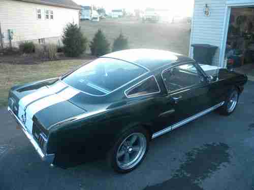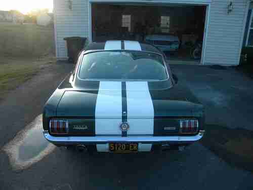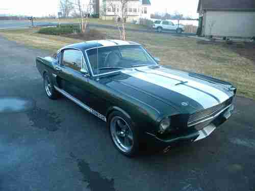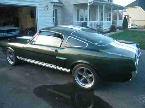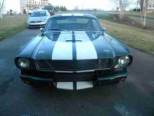1966 fastback GT-350 tribute restomod. Ivy green with white racing stripes PPG base coat/ clear coat. Heidts front suspension, coil overs, rack and pinion, base coat/clear engine bay, TKO 500 5 speed, leather interior, air conditioning, 347 small block, blueprinted/balanced/professionally built 450 hp, 3.55 moser rear, moser axles, aluminum driveshaft, wilwood disc brakes front and rear, 17x8 Torque thrust II, new BFG rubber, all auto meter gauges, fully jet hot coated headers/ h pipe/ Mac mufflers and tail pipes. Car is built to drive anywhere, nice restomod styling, Carrol Shelby signed glove box. Original A code, pony interior, 4 speed gt car. Tons of paperwork with car history and upgrades. Top of the line everything, no bolt left untouched. I have another project in line, this has to go.