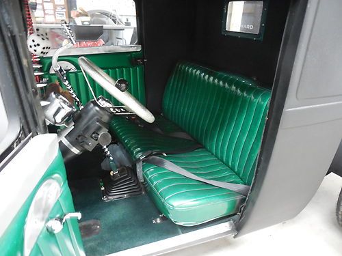 Interior - custom zodiak green seat, door panels, kick guards. Ceiling and back wall black upholstery. Gauges light up green. The shifter is twisted steel with wood stove handle.