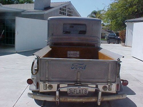 1934 ford pick up all steel old school barn find V8 flat head Ca. gasser rat rod vintage 1970s ? from the estate of a antiques dealer stashed away in a dry storage storage unit since 1997 outside of the pictures this is what I can tell you, when I acquired the truck the drivers side head and intake were removed and 1 valve was missing I don't see any damage internally I can only guess it was burnt broken or ? regardless im thinking this was why it was parked and left off there, the engine rotates just fine and I think its a easy fix for you flat head guys, one of the cooling tubes and head, intake bolts have disappeared and I could not locate the drivers side interior door panel or keys. There is a short info paper that I have when the truck was bought it includes a list of items as follows 1946 to 1948 mercury engine, 12 inch hydraulic brakes, drop axle, chrome 14 and 15 inch wheels, fenton intake, 97 stromburg carbs, daytona lazer seats leather, grant wheel, tilt column, 1940 bumpers with deluxe bumper guards, hard wood bed etc.etc. / sold as is with clear Ca. title, buyer responsible for pick up and transport for overseas buyers I can recommend some reliable shippers / terms sold as is, a $500.00 pay pal deposit due in no more than 24 hours of auction end balance due via cash casher's check or money wire in no more than 7 days of auction end no exceptions