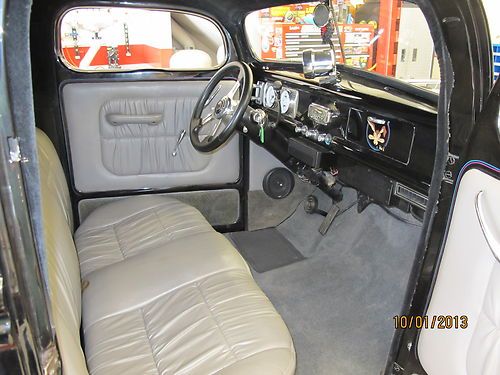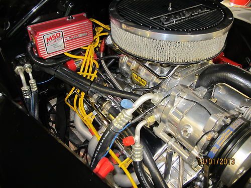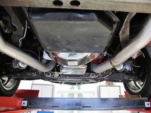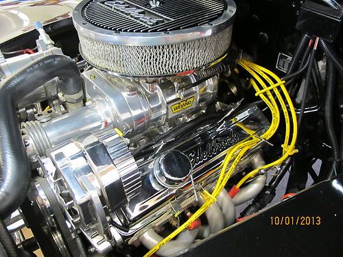 It also has a 350 trans with a 2500 stall converter and new flex plate, Chrome Engine Accessories, Painless wiring, Mustang II rack and pinion, Power Steering and Brakes, Disc Brakes in the front and drums in the rear, Front sway bar, AC, HPC coated Headers, Dual Exhaust, a Ford 8 inch rear end, Blue Headlights, Torque Thrust II Wheels and BF Goodrich G-force T/A 255/55 18 in the rear and 215/50 17 in the front. Power Antenna, AM, FM, CD Radio with two six inch speakers in kick panels.