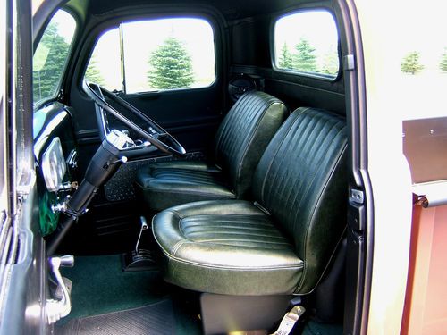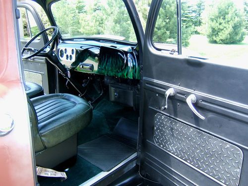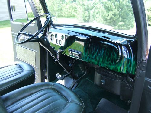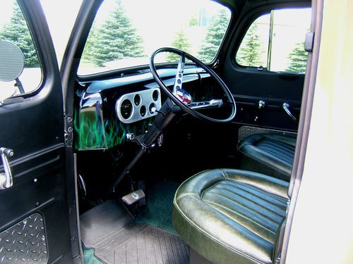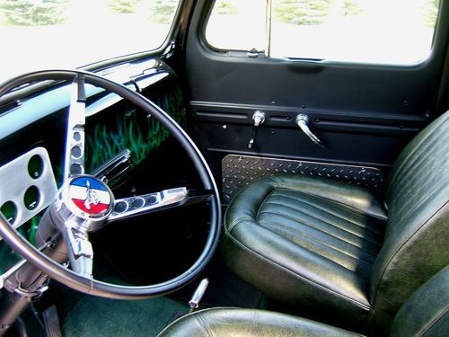 - Interior - Custom all steel dash with dakota digital guages and new stereo. Mustang steering wheel. Mustang bucket seats recovered. New Carpet. Painted flames on dash & diamond plate on door panels. Rest is hot rod black. Seat belts are vintage military lap belts