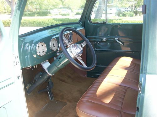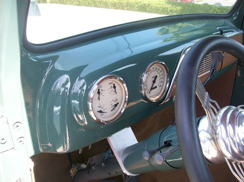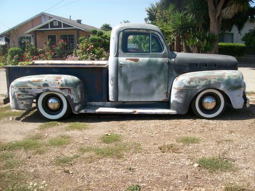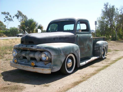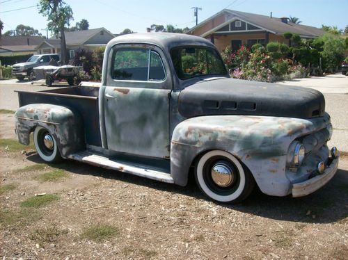 1952 ford f-1 rat rod truck. This truck runs and drives great, it has a 350 chevy motor, turbo 400 transmission and a 10 bolt posi. Using the stock frame, it has a Camaro sub-frame up front and chassis engineering spring kit in rear. Solid wheels, bf Goodrich silvertown white wall radials.. The inside has been finished with original style interior, Gas tank was moved to the back and a seat out of a ranger pick up installed (gives more leg room). Gauges are omegas. chevy steering column with banjo wheel. new carpet. All new glass and seals. Sits and looks great, gets plenty of attention and thumbs up... Buyer responsible for pick and delivery.