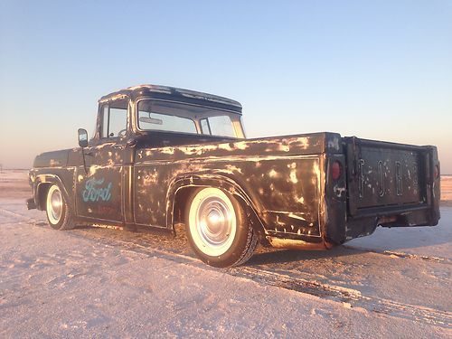 ~ With Todays Technology in Our Shop We are able to Build some of the Sweetest Rat-Rod's out their. Today We are offering with this No Reserve Auction, a 1959' Custom Ford Big Back Window, Short Bed Rat-Rod. This is a True Old-School' Custom Barn find from the State of Missouri... With it's all Original Patina' She Stands Out from all Others! This Custom Build has a High Performance Running 302 Edelbrock Holley TRW Fel-Pro Crain HEI Mallory Ext....... C-6 Hard Core TCI Shift Kit, Custom Colum Shift, Original Bad Stopping drum break's, Custom Frame work, Front & Back 6" C-Notch, New Wiring, Custom Cobra-Mustang White Interior, Custom Merc Steering Wheel, 390 Possie Rear-End...... Estimated 350 HP. This Truck is Extremely Quick, with Custom Harley Exhaust Mufflers.... High Bidder Gets This All Custom 59' Truck (Only One that Exist Like This) *****Click link to Below To View YouTube Video http://www.youtube.com/watch?v=00e4n9Vc8-A