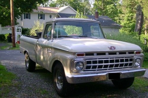 This is a 1965 Ford F-250 Fleetside Pick-up. It is the camper package with Twin I-Beam Suspension. The truck is in great shape with a solid body and has always been garaged. The odometer reads 22,242 miles. It does have a clear title. It has the auxiliary gas tank covers but no extra fuel tanks. This truck runs and drives well. It was not a frame-off restoration but many parts replaced and is very clean. The motor runs excellent and the truck drives highway speeds perfectly.