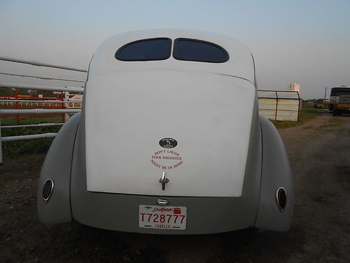 Custom Teardrop Trailer, Everything is brand new, it only has about 50 miles on it, made from two ford slantback sedans, custom trailer frame was made, the bodies were completely rebuilt, including all new metal along with the body being channeled and lengthend sides, New 2200lb axle with electric brakes running on keystone classic rims.The trunk has a air conditioner (central air) that slides out,the trunk also has a battery with a maintainer. The interior has all brand new parts including a flip out radio that plays dvds, because it has a flip down tv mounted on the roof its all hooked togehter so that you have 2 tvs with surround sound. Lots of lights and new burlap headliner, with vinyl wood floor and carpet sides. The exterior is white top with ford gray bottom both have flatner in it.All the glass is brand new and they all work as they should, up-down,back and forth. The bodywork is not perfect because i figured it would be sanded to match their hot rod, its good from a distance, the front trunk is where you crawl into, it is lengthened about 4 inches so it is easy to get into, it is on springs so that it stays up,let me know with and questions, pulls great down the highway!I know im missing so much info, all custom! ready for car shows and summer fun! Can help With shipping- the buyer has to make arrangements.Can end early No RESERVE Need to sell, make reasonable offer thanks