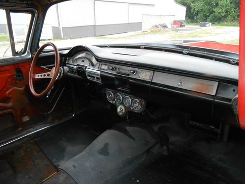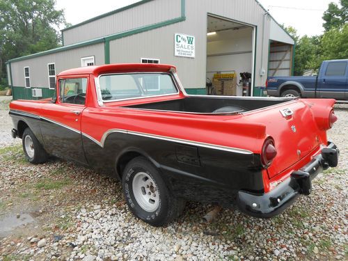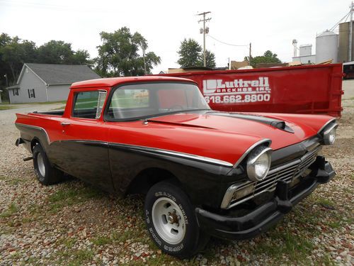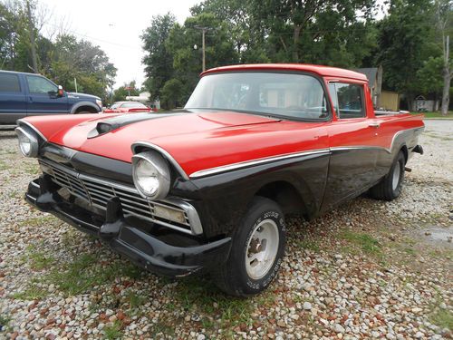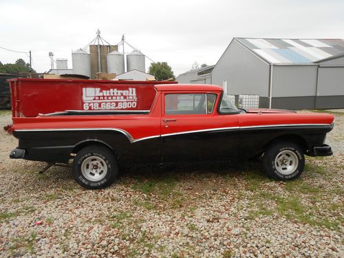 YOU ARE BIDDING ON A 1957 FORD RANCHERO. THIS CAR IS A ROLLER ONLY IT HAS NO MOTOR OR TRANSMISSION. IT WAS ORIGINALLY EQUIPPED WITH A 312 V-8 AND THREE ON TREE BEST OF MY KNOWLEDGE. THIS VEHICLE IS IN NEED OF A RESTORATION. THERE IS SOME BONDO IN BUT WOULD MAKE AN AWESOME CHEAP PROJECT. THE ONLY THING MISSING BESIDES THE MOTOR AND TRANNY IS THE SEAT OTHER THAN THAT EVERYTHING IS THERE TO THE BEST OF MY KNOWLEDGE. DON'T LET THIS ONE SLIP YOU BY THESE ARE VERY HARD TO FIND IN GOOD RESTORABLE CONDITION. IF YOU HAVE ANY QUESTIONS CALL ME AT 217-821-6138 OR 618-665-4442. !!!! IF YOU ARE AN ILLINOIS RESIDENT I DUE HAVE TO CHARGE SALES TAX, LISC AND TITLE. IF YOU ARE A AZ,CA,FL,HI,IN,MA,MI OR SC I HAVE TO CHARGE SALES TAX!!!!!!