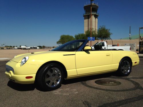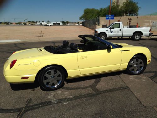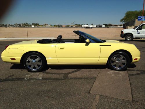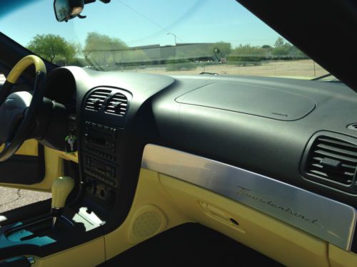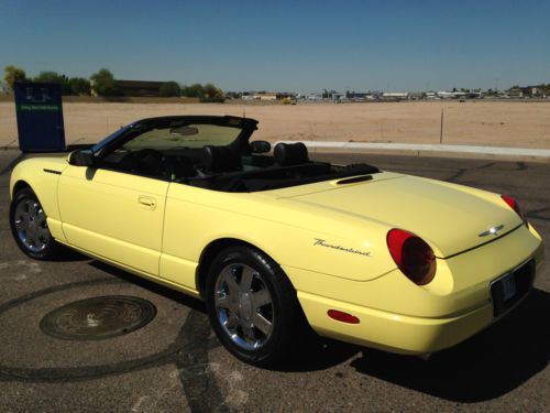 This 2002 T-Bird is in phenominal condition in all respects. It has the Hardtop, both keys, all books and records and is a California private party 1 owner. The yellow car was only produced in 2002 and thus making it a little more rare than other colors. This car runs, drives and looks like a teenage mile car and is quite obvious that is was cared for very well by it's owner. the car needs nothing other than a new home. If you have any specific questions feel free to call me at 480-540-0336.