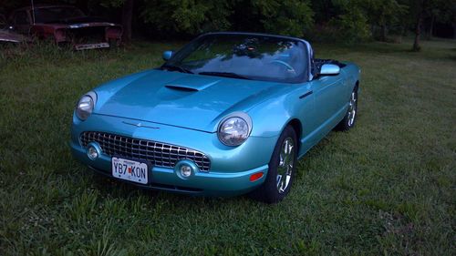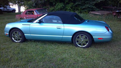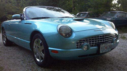 This 2002 Thunderbird has 18k actual miles. I purchased it several years ago from the original lady owner who was 70 some years young. It had 8,632 miles on it at that time. The 'Bird has only been drivin during nice weather. The original Michelin Pilots tires were starting to dry crack so I put a new set of Michelin Primacy tires on about 3,000 miles ago. The tires were over $1100. Besides a few oil changes and the tires the car has needed nothing. This T-Bird has the optional chrome wheels and interior accent package. It does not have a hard top. The original owner didn't want one because she said it would just be in the way. I agree. This Thunderbird has never been in an accident or had anything replaced. It looks like a car that's a years or two old, not ten. The car runs and drives perfect. If you're looking for a very low mile T-Bird to drive and enjoy during some nice top down weather then stop by for a test drive. You won't be disappointed. This car is priced to sell and won't last long. Call 573-230-6222 for more info.