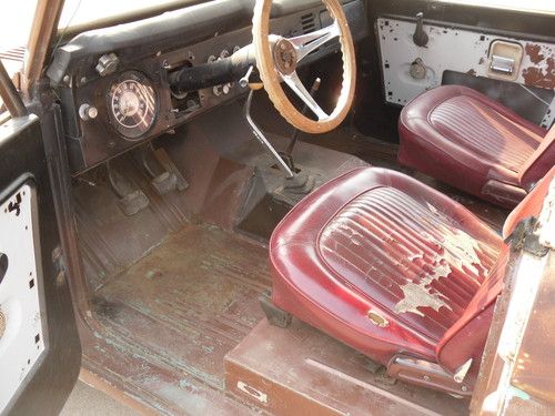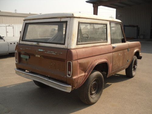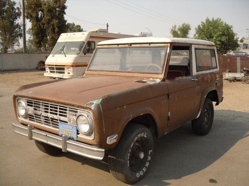 HERE WE HAVE THE DESIRABLE LITTLE BRONCO THATS HARD TO COME BY.IT IS COMPLETE AND RUNS AND DRIVES.THE 289 ENGINE IS TIRED,HAS A MANUAL 3 SPEED ON THE FLOOR. THERE IS NO RUST ON THIS TRUCK IT HAS SURFACE RUST ON THE FLOORS BUT FLOORS ARE VERY SOLID.IT IS RARE TO FIND ONE OF THESE WITH NO RUST.THERE IS ONE NEW QUARTER PANEL IF YOU WANT TO PUT THE REAR WHEEL WELLS BACK TO STOCK THE OTHER WOULD HAVE TO BE PURCHASED.THERE IS AN EXTRA 3 SPEED TRANS, BELLHOUSING, STEERING COLUMN AND PADDED DASH TO GO WITH IT.THE WINDWINGS ARE NOT IN IT BUT I DO HAVE THEM. THIS BRONCO HAS BEEN STORED IN A SEA CONTAINER FOR MANY YEARS AND COMES WITH A CLEAR TITLE FROM ORIGINAL OWNER AND HASNT BEEN REGISTERED SINCE 1981.THE BRONCO CAN BE VIEWED FROM 8-5 MONDAY THRU FRIDAY AND IF NOTIFIED IN ADVANCE WILL ACCOMODATE YOUR SCHEDULE. THERE IS NO WARRANTY OF ANY KIND EXPRESSED OR IMPLIED.THIS VEHICLE IS 45 YEARS OLD SO BE REAL IN YOUR EXPECTATIONS AND PLEASE ASK QUESTIONS. THE PICTURES SPEAK FOR THEMSELVES IT'S A VERY SOLID BRONCO FOR YOUR RESTORATION,HUNTING,ROCK CRAWLING,OR JUST 4X4 FUN.I CAN BE REACHED AT 1-661-333-7557 FOR INFO AND OFFERS. I AM NOT DESPERATE JUST THINNING THE HERD AND WILL BE LISTING OTHER CARS IN THE FUTURE SO KEEP THAT IN MIND AND BE REASONABLE.THANKS FOR LOOKING.