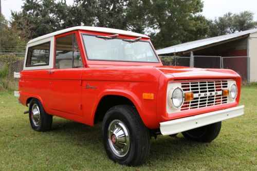 Another solid 1969 Ford Bronco brought to you by Velocity Restorations. We got this super solid Bronco in and have gone through it front to back. We are offering this Bronco as is for the buy it now price or as a restoration similar to the calypso coral Bronco pictures that are in this listing for $27k. If you are interested in having us restore this vehicle contact me before buying. Here are the high and low parts of this bronco. Body is extremely solid. Light surface rust in some areas, but no rot. Floor pans have been laid over and I would recommend inner rockers but besides that the rest of bed and body is super solid. Previous owner installed a new Centech wiring harness. All lights, gauges, and speedo operate properly. Interior is in very good original condition. Bronco seems to have had one repaint. Paint is obviously not perfect but still looks good driver quality. Doors, tailgate, and hood open and close easily. Engine was completely rebuilt within the last year. Compression is solid across all cylinders. Power steering and 4 barrel carb was added. Along with new wiring harness previous owner installed electric fuel pump and new gas tank. ORANGE BRONCO IN PICTURES IS FOR EXAMPLE OF THIS BRONCO RESTORED BY US FOR THE PRICE OF 27K. This Bronco is offered as-is where-is with NO warranty written or implied. Please complete all inspections prior to buying if you feel necessary. |