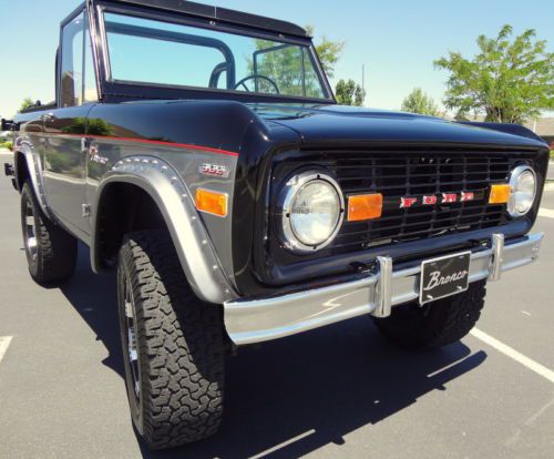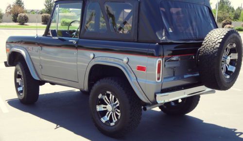 Very high quality restoration The paint and body are in near perfect condition. The paint color is gun metal grey and black, the paint is near flawless. The Bronco is 100% rust free. The frame, undercarriage and underside of the hood have all had professional anti rust coating applied. Equipped with 5 matching Incubus wheels wrapped with BF Goodrich All Terrain tires, Rancho suspension lift, locking hubs, chrome front and rear bumpers with front bumperettes, chrome headlight bezels and Dual gas tanks(both tanks are functional including guages) This was a very high quality restoration and all lenses, gaskets, seals, emblems and chrome was replaced or re-chromed. The 302 V8 runs flawlessly. It fires right up, idles smooth and accelerates with power. The dual exhaust has been upgraded with headers, offers additional power and sounds fantastic. The automatic transmission shifts smooth and the 4 wheel drive functions properly in both high and low range. The interior looks great. The Bronco has sound deadening material professionally installed under the new carpet. The seats are clean and comfortable. All the electrical and guages function properly. Equipped with a brand new Best top soft top with tinted windows. The Hardtop is also included in the sale (not pictured) Additional photos and a walk around video of the Bronco running are available upon request. Clean and clear title We can beat the eBay shipping quote by at least 25% Call 208-800-2829 |