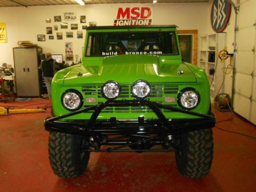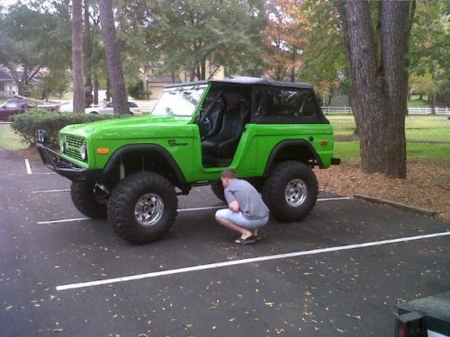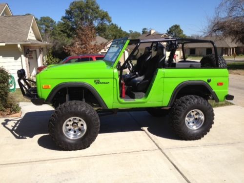 Professionally built by a company in Michigan. 1971 Ford Bronco on frame restoration, built from the ground up. Every item on this vehicle is either new or has been rebuilt. Of the original vehicle, I kept the frame and tub. I replaced the front quarter panels and put a fiberglass hood on. The frame has been painted and the interior is bedlined. There is a 5.5 inch suspension lift with a 3 inch body lift with 37x14 inch Irok radials on 15x10 American Eagle 589 rims with 1.5" spacers. I put a dana 44 up front with a Ford 9 inch in the rear, open diff 456:1 gears. The engine has been overhauled and this truck fires up every time, regardless of the weather. I put in an A/C and heater (the heater works great, the A/C doesn't really cool you off on an August day in Texas). Power steering, power brakes with four wheel discs. Corbeau racing buckets front and rear, full roll cage, and an impressive stereo system. Kenwood head unit with blue tooth handsfree for your phone, marine tower speakers on swivels in case you want to turn them around and have a tailgate party. JL 10' W3 subs. Everything on the stereo is waterproof with the exception of the head unit. This truck is a beautiful Bronco and turns heads everywhere I go. I am just selling it to purchase some different toys. This truck drives very well, and I occasionally go on the highway, though it prefers to run at 60 mph. Please text me if you have additional questions
