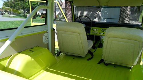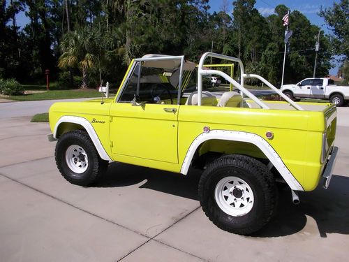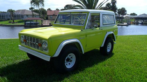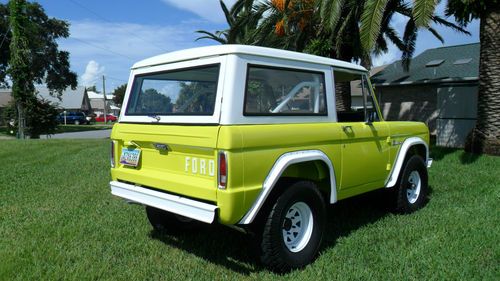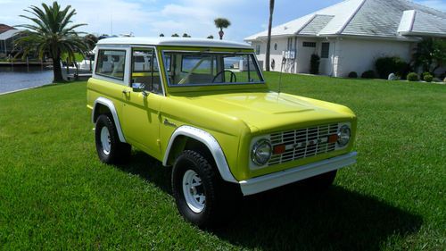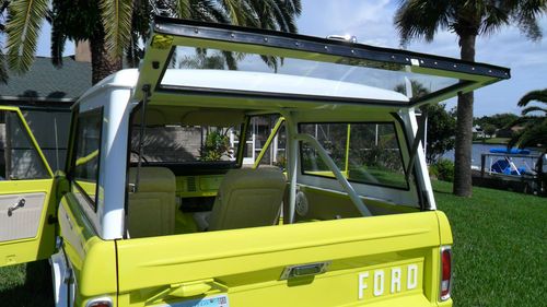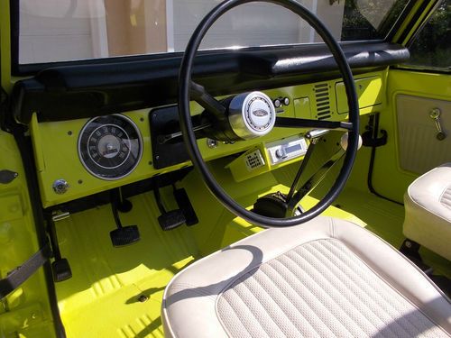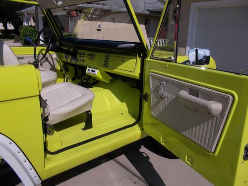Professional body off restoration just completed. Started with a 100% rust free Arizona truck. That means no floor patch panels or structural pieces replaced with flimsy re-pops on this one. Underside, inside floors and engine bay have coated with color matching rhino liner. Frame has been painted and sealed. Fresh paint in the original med lime green. 302, P/S, 3 speed. New brake lines, fuel lines, aux fuel tank, clutch, windshield, weather stripping and seals, and upholstery plus too much else to list. This truck is mechanically sound, everything works, no leaks. Every part has been restored, repaired or replaced by a Ford mechanic with 50 years of experience. This isn't a chopped up rock crawler covered in diamond plate with a roll bar where the dash used to be. If you want a driveable, original style Bronco that you can turn heads with at shows and cruise nights then this is the one for you.