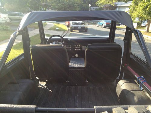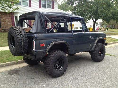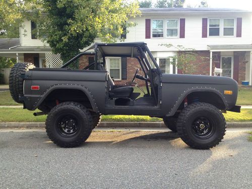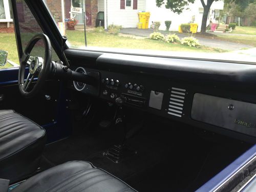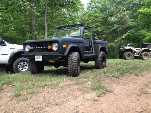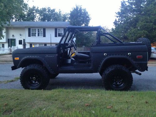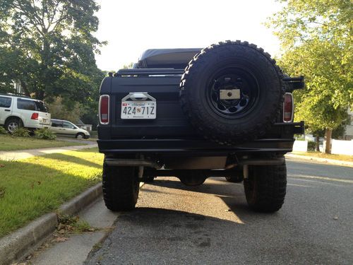 1974 FORD BRONCO, NEW FRONT DISC BRAKE CONVERSION, NEW WARN HUB, TWIN STICK J SHIFTER. NEW BEST TOP - FULL SOFT TOP, BIKINI TOP AND HARD TOP. NEW PERTRONIX IGNITOR SYSTEM. NEW REAR AXLE BEARINGS AND SEAL. FRONT ROLL GAGE. 1979 BRONCO FRONT SEAT REUPHOLSTERY. BOTH FLOOR PAN REPLACE IN FRONT. I DO HAVE A ONE PIECE CARPET SET THAT WAS IN IT. I DO HAVE THE BACK BENCH SEAT. HAVE A USED HYDRO BRAKE BOOSTER. HAVE ONE NEW RIGHT ROCKER PANEL NOT INSTALLED. 5 LIKE NEW TIRES AND RIMS WITH ABOUT 5000 MILES ON IT. NEW AUXILIARY FUEL TANK AND SENDING UNIT BUT NOT INSTALLED. HAVE A PRERUNNER BAJA BUMPER.WIRED WHEELED THE WHOLE INSIDE TO CLEAN IT UP THEN HERCULINER THE INSIDE. THE RIGHT SIDE ROCKER PANEL STARTING TO SHOW RUST, BEHIND THE FRONT LEFT FENDER AND ON THE BOTTOM DOOR POST AND INSIDE STRICKER POST. HEATER BOX BEEN REMOVE TO CLEAN UP BUT HAVE NOT PUT BACK IN. WHILE WORKING ON IT I PAINTED THE TRUCK FLAT BLACK. I DO DRIVE IT A COUPLE TIME A WEEK AND ON TRIPS. MORE EXTRA PARTS