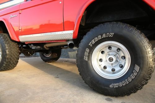 1974 Ford Bronco Early Frame Off Restoration. RestoMod. Motor Swap. Body Swap. This is an amazing Early bronco, it looks great, dialed in mechanically and drives wonderfully. It will crawl or cruise (well) over highway speeds. I drive it often up and down the highway to work or out on the town. It tracks straight, shifts smooth and has no slack in the steering. The Bronco has a pronounced sound, with a nice deep growl produced by the 351 with headers and true dual side pipes. It is tagged, titled and inspected. All lights, electrical and gauges work too, of course. The Bronco has had a number of modifications and improvements over the years, in multiple phases. It began years ago as a frame off project from the ground up. All components were improved. The frame was sand blasted and epoxy painted. Suspension replaces. The drive train was imported to a Winsor 351 with C4 Automatic transmission. Then topped off with a new fiberglass body, fenders, hardtop and hood; there is nearly $10k just in fiberglass parts (doors and tailgate are OEM metal). In more recent history it has brand interior; new smittybuilt front and rear seats (spice color), seat belts, new stereo (6x9s amp 12” sub), interior bed liner and matching soft top. I also have a fiberglass hardtop that is white, which will be included in the buy it now price. If you do not care for the top I will lower the buy it now. New professional bodywork and paint with warrantee (factory red.) dash and interior doors also painted. It is a good driver quality; prime, 4 coat red, 4 coat clear. Paint is not show quality; it has not been wet sanded and buffered so therefore has a few imperfections. But it works well from me, I didn’t want to overdo it and the paint detour me from using the truck at the trails near my house or letting the kids and dogs pile in and have fun cruising as a family. The odometer shows 46k, I don’t have evidence if this is the actual mileage or if it is truly 146k, but given it’s a restored condition, and a motor swap, the mileage is not a true depiction of the truck and of little concern. More Details and Specifications: · Custom bumpers – 4” square tube with grill guard – silver powder coat (light bezels also power coated) · New Stereo – CD\USB, 5.5”s, 6x9”s Kenwood amp and 12” sub · Dana 44 and Ford 9” both with 4.11 - Both axles rebuilt · 23 Gallon fuel tank · Chrome Power brakes booster · Power steering · Pro Comp Mud Terrain tires – 35x12.5x15 · C4 Trans – Rebuilt – very firm shifts · 351w motor - Rebuilt · Flow Cooler aluminum water pump · Edelbrock Performer intake · Holley 750 double pump- dialed in, very consistent and reliable · Duff oil pan and pickup tube · New seals on oil pan, water pump timing cover · Main seals front and rear · Duff headers – 2.5” into glasspacks with 3.5” turn downs in front of rear tires to the sides · Flow Kooler 4 core radiator · Battery mounted in right rear · Kentrol fiberglass body - OE doors, windshield frame, and tailgate · Kentrol fiberglass full top with Duff tinted bubble windows = If you don’t care for the hard top, let me know, I will reduce the buy it now price. · Bronco Graveyard Family roll bar · Door panels are diamond plate · OE gauges work properly · Bumpers powder coated, new starter, battery, alternator, voltage regulator, air cleaner assembly and engine main seals · Superlift adjustable track bar · Duff 2” variable rate springs · Duff poly bushings · Duff track bar drop bracket · Rancho stabilizer · Duff shocks (4) · Rancho RS-5000 shocks(2) · Bronco Graveyard traction bars (above leafs) · 3” body lift · Dana 20 Transfer case · Fyi-The diamond plate bed rails are only permanently installed. I haven’t decided if I like it better with or without. This is my personal truck, so I obviously cannot offer a warranty or guarantee. The truck is also for sale locally, so I must reserve the right to end the auction anytime for any reason. I’ve attempted to list everything as accurately as possible, but please feel free to ask any questions I will be happy to address (but due to the magnitude of questions and effort it requires to address, I must ask that you only ask questions if you are serious or have actually bid on the truck). |