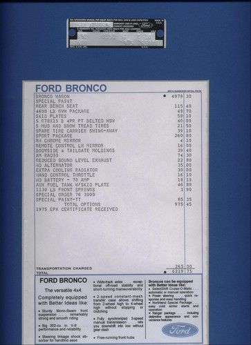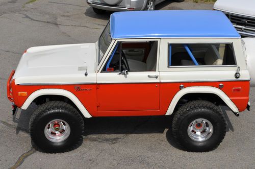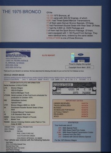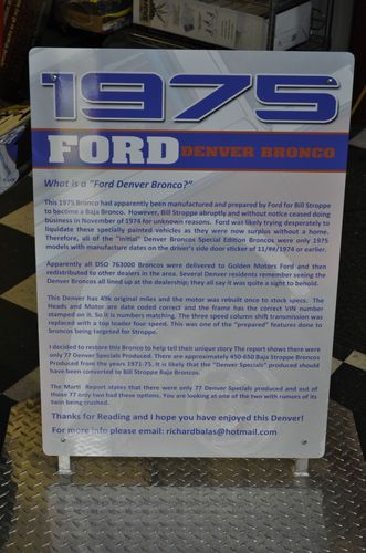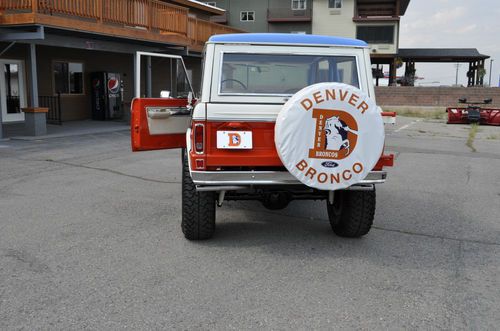 1975 Ford Bronco Denver Special. There were only 77 of these Broncos made and only 2 with these options. This is 1 of the 2 with rumors of its twin being crushed. I have spent two years gathering information on this SUV and it has a very interesting story behind it. Complete frame off restoration and it looks incredible. Numbers matching rig with some upgrades to the engine but mostly stock. When I bought the Bronco it had Black interior so the whole interior is brand new. I have pictures of every part, and pictures of the vin # on the frame. The Numbers on the engine identify it to be the correct motor so it is numbers matching. Very unique Ford with lots of money invested in its restoration. Complete powder coat and paint from the the frame up, lots of pictures and copies of the Deluxe Marti Report that backs up its history. A very nice and rare piece for a Ford Collector, or a Serious Denver Bronco Football Fan!!! I have spent two years doing the research and restoration work to bring this very interesting Bronco back. There has been well over 1000 hours invested in its restoration. Please email for specifics....