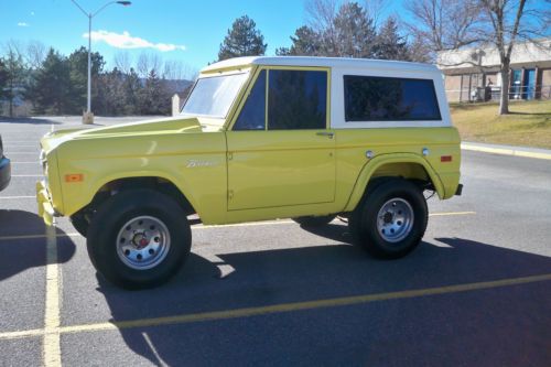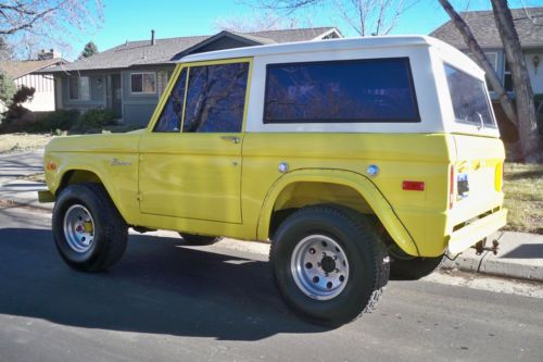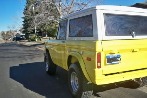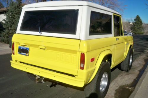 Exterior. Newer paint - 5 years old, looks real nice, not wavy, I think he said it was $5500 to paint it. It was painted with the top off. Jams are painted same color, it's is cut, nice flares, fiberglass cowl hood, newer 32x11.50x15 tires with ford Alumimum wheels, hard top, doors open and shut flush, new door handles, needs door mirror (I have a new one, it just needs to be installed), overall very good looking DRIVE TRAIN 302 V8 has 15,000 miles on it, bored 30 over, aluminum intake, new 650cfm 4-barral carb, headers, Mallery ignition, Unilite distributer, runs Great, 3 speed tranny, power front disc brakes, Dana 44LS front-4.10ratio,f ord 9" open rear-4.10ratio, Dual rancho shocks, power steering, Warn hubs, all front bushings replaced in front, runs real good,, INTERIOR after market seats look nice, but if you prefer factory seats, I have some nice factory seats that I will give to buyer, dash has all been changed to custom, some gauges not working just need to be hooked up,Tilt,Custom 6 point roll cage,It has a real nice sound system amp woofers and Cd player. needs rubber seals. Overall this Bronco Is very nice, not perfect but real nice,looks to be pretty rust free, pans look good, rockers look good, door brace looks good. Please call If you have any questions 303-638-6972 This vehicle is sold as is and all sales are final. So please ask all your questions before purchasing, or have the vehicle looked at, please. I have tried to explain everything as best I as can, but if I have left something out or you need more clarification, again, please don't hesitate to call. |