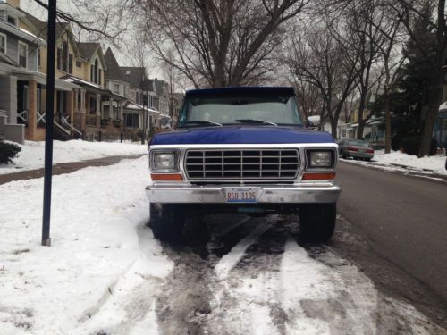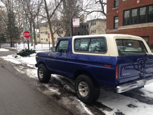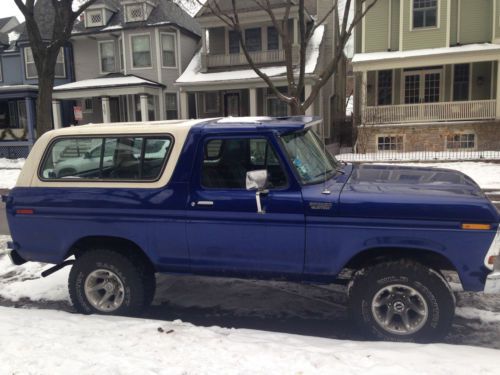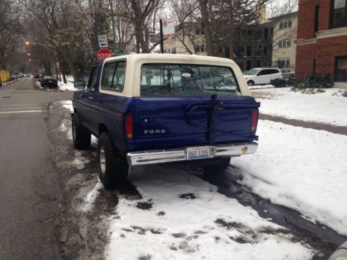 Condition: Very good condition 1978 Bronco Custom. Runs and drives very well for 35 year old car that has not been fully restored. It would be difficult to find original Bronco in better condition. Completely reliable and easy to start in cold or heat -- always turns over on first try. Body in good condition with little to know rust, unlike many Bronco's from this era. Bright blue paint is not original color -- not certain when paint job was completed but looks to have been done in last 10 years. Starting to see minimal signs of surface rust on interior corner of doors and door wells (so minimal that it is difficult to see in pics). The car was located in AZ until 2008. AC doesn't work. AC Compressor is present but not hooked up. Heater works. Heater vent fan bearings are starting to go and making noise but works (~$35 for new fan). New alternator and battery in Spring 2013. New exhaust/muffler in summer 2013. New Brakes in Fall 2013. $1500 spent on completely new brakes replacement/overhaul (new front rotors, calipers, rear drums, and brake lines). Tires have plenty of thread. The rear window, which is often an issue with these vehicles, is fully operational. Interior is black vinyl floor with some tears. Front seats and rear are original blue vinyl. Front seats have some tears and are covered with cloth seat covers. Rear seat is in good shape with minimal tears. Constantly getting compliments on this truck.