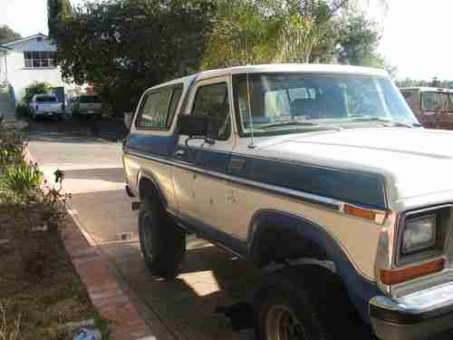 1979 Ford Bronco 4x4 with 1993 Dodge Cummins 5.9 intercooled turbo diesel, NV4500 transmission, new main shaft, cast iron transfer case adapter, Ford 205 transfer case bolt straight on with no adapters, 1350 rear CV drive shaft, 10.25 8-lug Ford Sterling rear end with disk brakes, Dana 44 front end with 8 lug outers, hydroboost master cylinder, 6" suspension lift, longer radius arms, 4" stainless steel exhaust, and Grant steering wheel with cruise control buttons. Comes with spare parts: two extra doors and tailgate, interior dash parts, factory spare tire carrier, 30 gallon gas tank and skid plate. Air conditioner and heater both in good working condition. Turbo upgraded to HX35, waistgated, 12 mm-2 exhaust housing. Injection pump has been rebuilt - injectors were pop tested in good working condition. Rest of the motor is stock. Paint is original. Two minor rust spots in door jam (size of 50 cent piece) and some surface rust spots. Rear tailgate has some rust, but comes with an extra tailgate in good condition. Vehicle is titled as diesel in California. Payment description: $500 deposit within 24 hours of auction end and full payment (cash or cashiers check) upon pickup. If you wish to have it shipped, I can assist with your carrier choice. I have this vehicle for sale locally and reserve the right to end this auction at any time. Please feel free to ask any questions (Mike 619-699-9000).