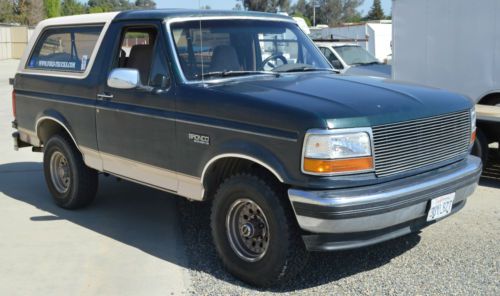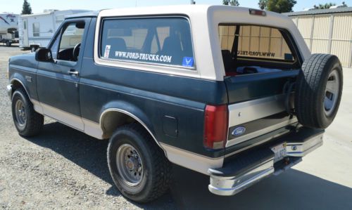 Selling my 1993 Eddie Bauer Ford Bronco. Owned it three years, and love it, however, I need to get something smaller for better mpg. Don't let the 242k miles fool you, this engine is still plenty strong and does not smoke at all. It does have a small oil leak on passenger's side of engine. Have replaced battery, spark plugs, spark plug wires, distributor cap, and rotor, along with an oil and filter change about 6 months ago. Air filter was changed then also. Replaced all three power window motors. Installed a five panel rear view mirror. Billet grille and upgraded headlight housings. Tires still have 80% of the tread on them, spare tire is a used one from a local junkyard. May want to replace that one. Replaced cracked and torn front leather bucket seats with cloth ones from an F150. Rear seat is still leather. Front hubs replaced with Warn manual locking hubs. 4x4 system works great. Been to Pismo Beach 3 times, and Cleghorn, and Ballinger once each. Starter and both solenoids replaced six months ago also. Have made numerous trips to So Cal with no problems. It has a factory towing package, which includes a transmission cooler, and the hitch ball mounted on the bumper. It has an old 4 plug trailer connector, but I will include the adapter to tow a U-Haul trailer. Had stereo and speakers replaced six months ago also, and a Viper alarm. Headliner is in perfect condition, and carpet has no rips, but does have some stains. Can remove decals on rear side windows before new owner takes possession. Have title in my name in hand, and just registered vehicle til April of 2015. Also, can deliver vehicle within a 500 mile radius of Fresno for the cost of gas (at present prices, figure a dollar a mile) as I have an F350 and car trailer. Am still using vehicle as a daily driver so mileage will keep going up until sold. Also have a fuel pressure regulator, and air temp sensor that should get installed before it is sold, but if not, I will include them in the sale. Rear window will go up and down with no problems, however, only with the dash mounted switch, it will not work with the key switch in the rear door. Please don't hesitate to ask any questions about the vehicle.
