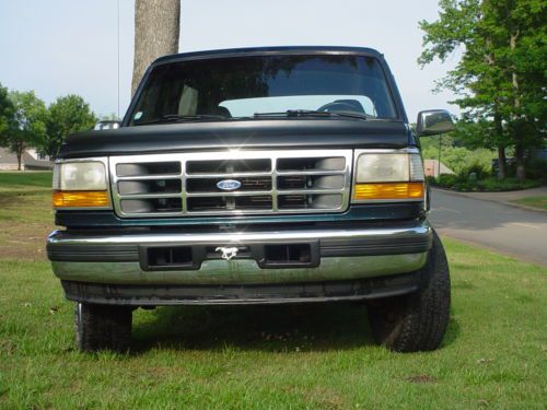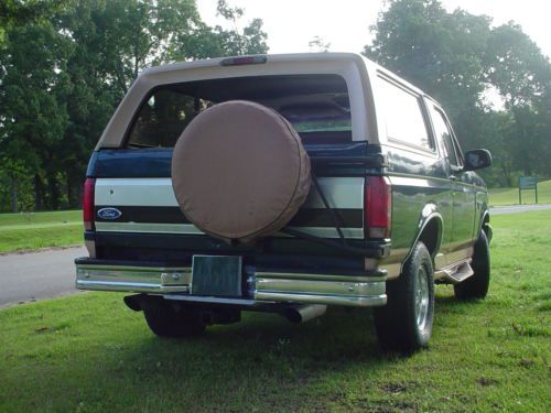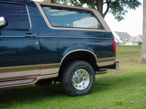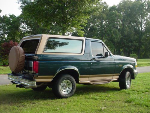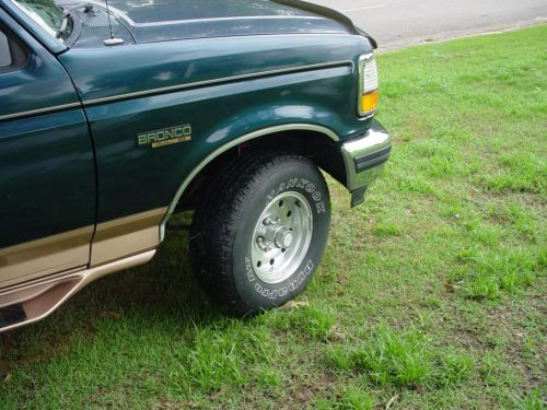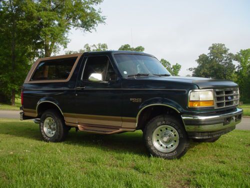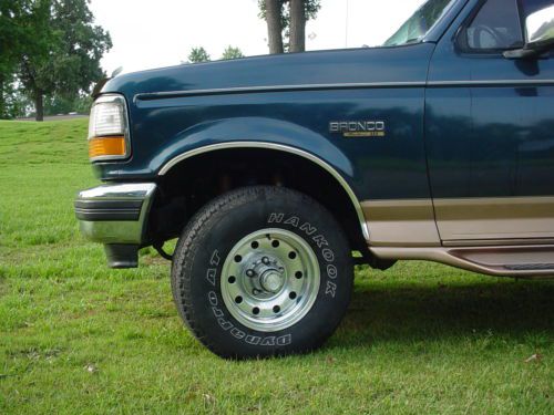 NO RESERVE! 1995 Eddie Bauer Ford Bronco 4WD. All original except for aftermarket AM/FM/CD player. Bronco is a Southern vehicle with all original chrome including chrome wheels. Virtually no rust on either exterior or frame. Tires are recently new. Everything is working as it should although the air conditioning could use a freon charge. The 4WD engages properly and the engine runs great and the automatic transmissions shifts as it should. The vehicle has a custom exhaust system. The leather seats are in very good condition especially when one considers the age of the vehicle. I do not hesitate to drive this vehicle anywhere. Original green paint is faded in some areas. I have been told that this could be brought back by polishing but to date I have not polished these areas. The vehicle is for sale locally so the seller reserves the right to end the auction early.