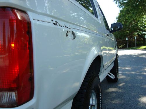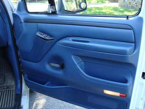 Up for sale is my 96 Ford Bronco. The last year for the Bronco so it has the mass air flow 351 instead of speed density system. The 351 runs smooth and is very quiet. Has no exhaust leaks plenty of power. I really do not want to sell it but I have lost my garage space and it is to nice to sit outside and rot.. The Bronco originally belonged to the Washington DC Police dept.. It is too clean to be a fleet vehicle so it must have been a reserve unit.. The wiring for the lights and siren is still under the dash. There is a small hole in the roof where the wiring came through for the light bar. As far as I am aware ford never made a Police package for the Broncos. This one has a very large factory trans cooler and what feels like a shift kit in the trans..I have owned several Broncos in the past and all of them had the small Trans cooler, never saw one from the factory with the larger one like used on the F250-350 trucks.. Also having the 5.8 it may have been a police package or heavy duty package.. Has the quad shocks with front and rear sway bars as well. The tires are practically new and have less than a 1000 miles on them. new walker quiet flow exhaust, All new moog ball joints and tie rods with grease fittings.. New oil pan from ford, "original one the paint was flaking off and started getting rust on it" New fuel tank, New axle "u" joint with grease fittings. new Autolite copper core spark plugs,Ford Motorcraft battery was replaced 2 years ago.. Any maintenance item on the truck that needed replaced I have tried to stay with factory parts.. all power accessories work.. Ice cold A/C, Rear power window goes up and down smoothly ..Currently it has mobil1 synthetic oil with motorcraft oil filter with 2000 miles since last oil change.. The interior is not sun faded and the exterior paint is original with no fade as well. I have always used floor mats to protect the carpet.. I am a non smoker so it has never been smoked in. When I first purchased the truck there was a ford emblem and a bronco emblem on the right rear fender that somebody glued on.. I removed them and they left some adhesive that will need to be removed.. I did not want to try myself, was afraid of messing up the paint.. There are some blemishes as follows: The center consoles blue paint is flaking off showing the original tan color.. I think that is the way it came from the factory.. prob ran out of the blue ones at the factory since this is the last year of the bronco.. The grille has a crack in it as shown, There is a dent right behind the pass side tail light.. there is some rust on the tailgate bottom and the pass side door, There is a small ding on the hood, and on the drivers side door. In certain lighting conditions you can see a outline where the police decals were.. I am sure with a good wax job they will dissapear.. there is a small dent above the tail light.. Overall this is a clean low mileage example of a classic suv that Ford should have never stop manufacturing.. The truck is not museum quality but very clean for its age,I have tried to describe all the major defects, look over the pictures and feel free to ask questions.. sold as-is with no warranties..