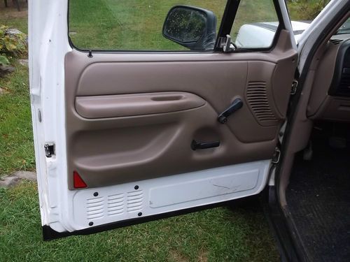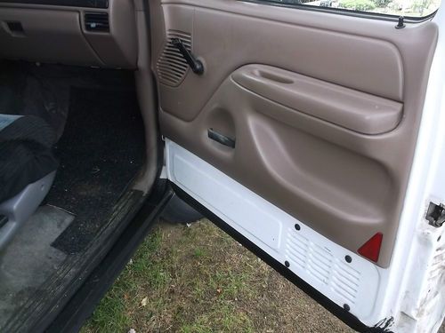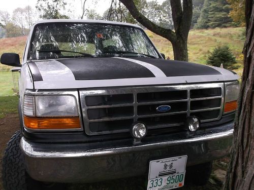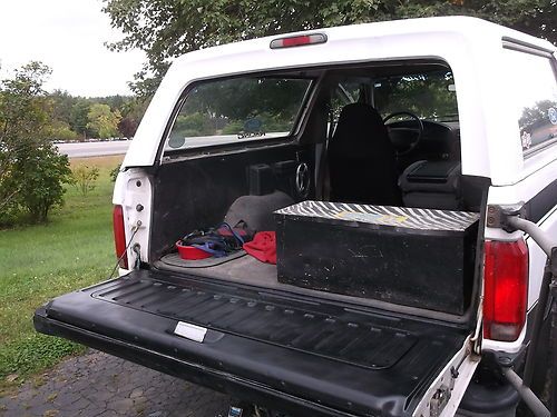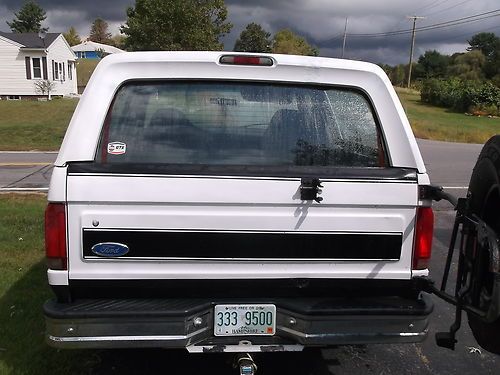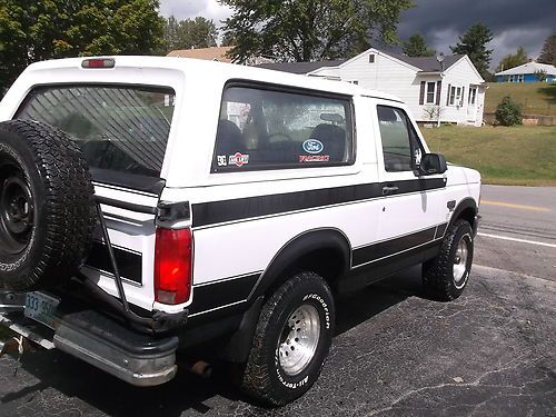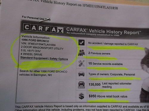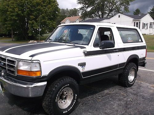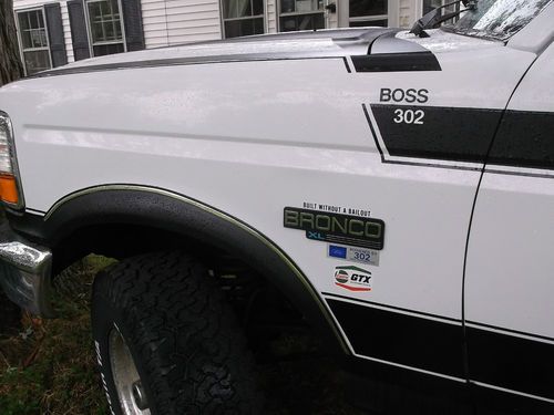 rare BRONCO! colorado origin factory power optionsand carpet delete, with bucketsand mid section for 3rd seat ing up front!and storage compartment flips down when not in use,, rear bench, ICE cold A/c, 5speed (new clutch) mated to a factory 302!EFI v8( i had done a retro stripe and labels for the 1970 "boss302" mustang model- look alike,,looks awesome gets plenty of waves, , and doesn't look like the famous "oj" escape suv!)!!!!!! runsand shifts/drives incredible!!! clear+clean car fax( carfax says add $900 to value for past history+ condition) 2 owners 16 years, real nice sony cd+ipod w/ 4 speakers+wired for sub, recent tune, aiternator,OPTIMA battery, clutch, cd system, front torsion bars, + rear brakes, frames real clean, as well as body, fender wheelsand mint rockersand never touched rear tailgate!! with r power window, goes up like new!!lfront buckets have cool "dickeys" seat covers but are in great shape, see pics, with less than 7800 yearly miles, this is a great example of last year convert bronco, and with,, options, ie., rare thepower train..,32 inch BF goodrichs on deep dish allum-alloys, rear tire carrier with full size spare, Class III tow package,manual lock in hubs, castrol oil +motorcraft oil filter always,+changed every 5,000 miles, getting drivers mirror and new set front brakes, to be included, goes down road @ 65mphto -75 in all 5 gears like it did in 96(reverse slips in+out as easy)! for sale locally reserve to sell or trade if option comes up,, i drive it daily, miles might go up slightly, couple hundred miles,,,,.. if close by please come view and drive any time, can deliver within couple hours and or can assist with buyer pick up or bring bronco to shipper for buyer if needed?? ,, (i'd drive anywhere!! we had unseasonable weather this week, horribly humid 95 degrees,,and the air cond worked AWESOME!!!) any??,,please send email!! thanks!XXX HAD TO RELIST couldn't add newer pics but all are on!!