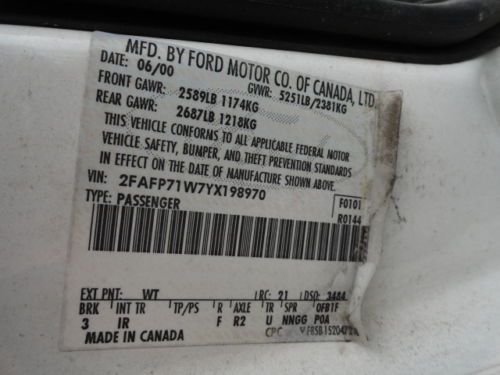NOTE: PAYMENT CAN NO LONGER BE MADE AT PICKUP. THE PURCHASING DEPARTMENT HAS MOVED AND PAYMENT MUST NOW BE MADE AT 100 CHEROKEE STREET SUITE 260 MARIETTA, GA 30090 PRIOR TO PICKUP OF VEHICLE. BOTH PAYMENT AND PICKUP WILL BE BY APPOINTMENT ONLY. DROP-INS ARE NO LONGER ALLOWED. PICKUP HOURS ARE MONDAY-FRIDAY, 8 AM – 11 AM & 1 PM – 3 PM. NO EXCEPTIONS!!! 2000 White Ford Crown Victoria 4 Door Sedan Vehicle # _ 4659 This vehicle can be driven to be loaded but we recommend towing off lot. VIN #2FAFP71W7YX198970 Mileage: 169,973 Cosmetics/Condition · Front chassis parts worn out – upper and lower control arms · Exhaust crossover pipe broken · Coolant leak · Right rear quarter panel damage · Surface nicks/dents on body · Plugs in roof/deck lid · Headlight buckets stained · Driver side mat worn · Interior stains The specifications of the vehicle are listed below. Mechanical · 4.6L V/8 engine · 4 speed au Safety & Security