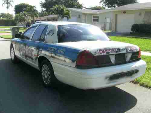 Hello, you are bidding on a 2004 Ford Crown Victoria Police Interceptor with a LOW 113K original Florida Highway miles, Rust Free, Florida Cruiser! This car has a clean/clear Florida title. Car must be paid for within 48 hours of auction close via a overnight sent a cashiers check, bank check or money order. Car runs, idles, drives and shifts excellent. Blows ICE-COLD A/C. AM/FM radio all speakers sound great. Interior is complete NO holes on dash. NO rips/tears in seats. Steering wheel shows NO wear. Police dome light works. All interior lights/buttons work. Headlights are NOT foggy nor do they condensate. All exterior lights work as well pictured. Has a year old Interstate battery. Complete set of 4 almsot Brand New Goodyear Police Issue tires. Car has NO undercarriage rust what so ever. This was a City of Homestead Police Patrol Unit vehicle, it was a take home car. Always maintained using Ford OEM parts with Motorcraft Oil Filter and Oil every 3,000-5,000 miles. As you can see by the pictures this car will most likey need a paint job. I originally bought the car for me with plans to plug the holes on the roof from the Police Lightbar and gps/antennas and have it sent to recieve a brand new paint job but I have recently moved into an apartment and no longer have the funds to do this. This car will make a excellent deal for a Taxi Cab company or just someone who has $500.00-$800.00 for nice paint work. You can find excellent deals on U-Ship from as low as 100 bucks to ship this to your doorstep anywhere in the United States and International. You simply go on there and pretty much bid on how much you the buyer wants to spend as this car can not be drived on Florida highways with the "CITY OF HOMESTEAD POLICE PATROL UNIT" decals still in place. I peeled off as you can tell some of the blue decal just to show that the decals simply do just peel off. Any questions please feel free to ask. LOW starting bid, NO reserve. This car does not leak any fluids what so ever, has excellent oil pressure and all else as seen in pictures. Good luck,