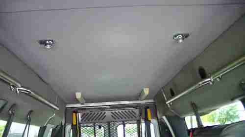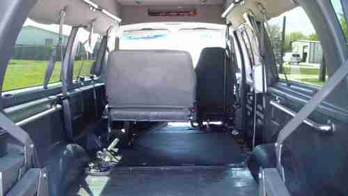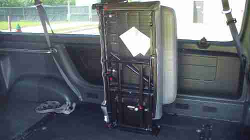 The lift in the rear is a Braun heavy duty series which can lift 800lbs with a really long platform. The back also has the raised doors for more head room when loading. There is a 2 man bench seat that can be folded down for extra seating or folded back up to make room for another wheelchair. There are tie down points for 2 chairs, 3 chairs look like they can fit but I'm not certain of that.