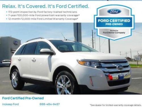 Inskeep Ford is pleased to be currently offering this 2013 Ford Edge SEL with 15,791 miles. Rest assured when you purchase a vehicle with the CARFAX Buyback Guarantee, you're getting what you paid for. With its full CARFAX one-owner history report, you'll know exactly what you are getting with this well-kept Ford Edge. You know exactly what you are getting when you purchase a Certified Pre-Owned like this Ford Edge. If you're in the market for an incredible Ford featuring an Entertainment package that will surely keep your passengers enthralled, then you'll definitely want to check out the Ford Edge SEL. This Ford includes: 6-SPEED AUTOMATIC TRANSMISSION 3.5L TI-VCT V6 ENGINE (STD) 204A EQUIPMENT GROUP ORDER CODE MEDIUM LIGHT STONE, LEATHER SEAT TRIM PWR LIFTGATE 20 CHROME-CLAD ALUMINUM WHEELS WHITE PLATINUM TRI-COAT METALLIC HEATED SEATS Relax, it's Covered. It's Ford Certified. After passing a rigorous 172 point inspection is a pre-owned vehicle Ford certified, complete with limited warranty coverage and 24-hour roadside assistance. 5 key points to CPO *7-year/100,000-mile Ford powertrain coverage *12-month/12,000-mile Ford limited warranty coverage* 172-point inspection by factory-trained technicians * Carfax Vehicle history report*24/ 7 Roadside Assistance Please visit www.dealerrater.com/inskeepford to see what folks are saying about us at INSKEEP FORD.... More information about the 2013 Ford Edge: The Edge is in its second generation, and Ford has upped the style and sophistication of its popular crossover. The result is an exciting alternative to competitors like the Nissan Murano, Chevrolet Traverse and Hyundai Tucson. With three great powerplants, athletic handling, loads of available technology and an MSRP starting at $27,525, the Edge provides real value in the crowded crossover segment. Strengths of this model include Attractive, aggressive styling, interior comfort, available technology, and three exciting engine choices Inskeep Ford is a three time Presidents Award Winning Dealership. We also have an Award winning service department with Ford Certified Technicians. We carry a large line of Pre-Owned vehicles. All payments listed are with approved credit, some restrictions apply. Need more information? Please call 888-238-0940 or visit our web site www.inskeepford.com