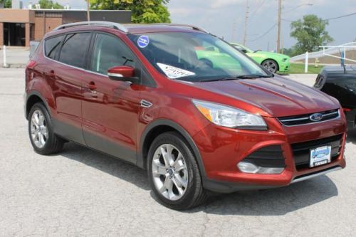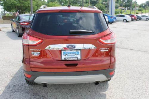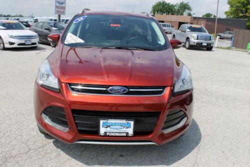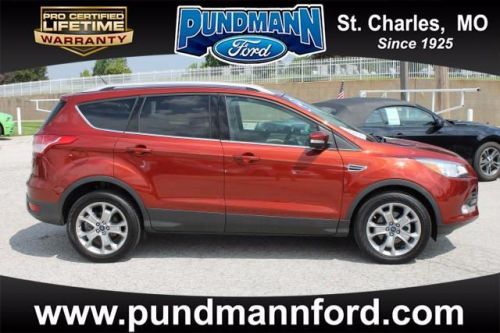 Call Now, 877-666-0327 Only At Pundmann Ford!! Our 2014 Ford Escape Titanium FWD shown in Sunset is the top dog! The 1.6 Liter EcoBoost offers 178hp on demand while paired with a 6-Speed Selectshift that helps bring in an impressive 28mpg. Torque vectoring control gives you awesome response and agility in the turns and believe me it handles like a dream. Chrome exhausts and accents, rear spoiler and fog lamps add to the sporty feel plus the sweet Titanium badge. Escape is environmentally friendly using recycled and earth friendly materials on it's interior while still retaining a luxurious modern feel. Voice-activated MyFord Sync w/ RCA inputs for gaming systems and SD card reader, ambient lighting, a leather wrapped steering wheel and shift knob, heated leather trimmed seats and unique accents throughout make you feel like a rock-star. Passengers have plenty of room to relax and ride in comfort while plugging in their devices to their own power points. Escape is big on safety with six airbags, Roll stability control, SOS post-crash alert, tire pressure monitoring and traction control all ensure your safety on the road. MyKey lets you customize features such as speed and volume controls for the young drivers of the family. You have chosen a great versatile SUV with the new 2014 Escape Titanium! Once behind the wheel you will know this is one of the most intelligent vehicles on the road today. Print this page and call us Now... We Know You Will Enjoy Your Test Drive Towards Ownership! Pundmann Ford has been in St. Charles since 1925 and remains as the only New car dealer in the city. Pundmann has a complete selection of Pre-owned vehicles meeting a wide variety of consumer needs from lower budgets up to premium models.Call, email or stop by today877-666-0327
