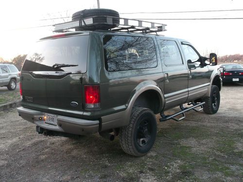 Picked up a 2005 Ford Excursion Eddie Bauer Edition. Literally every option that was available in what was the largest SUV mass produced for the general public. Power windows, locks, heated leather, rear DVD entertainment, more climate control settings than you can shake a stick at. It has the 6.0 Turbo Diesel engine in there which purrs like a kitten, zero modifications to the engine except a K&N Air filter system was added and a new K&N filter was recently purchased and installed by myself. What more could you ask for? How about a pretty boss looking brush guard up front. Not enough you say? Fine fine how about a lift kit with black rims to make this even more of a monster. What? more? Ok ok fine it has the most bad ass looking roof rack on it I've ever seen put on a vehicle which is currently being used to house the spare tire.