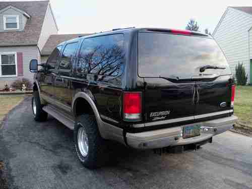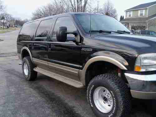 Hello. I have for sale my very clean and well maintained 2000 Ford Excursion. I have maintenance records available from previous owner and myself. This Excursion drives and looks great. Interior is mint except for small amount of wear on drivers seat. Everything works including power locks and windows, heat and A/C including rear climate control, cruise, power heated seats. This is the ultimate hunting, camping, or large family vacationing vehicle available which is why I purchased it. We did a couple family trips last summer and it was great with plenty of room for all the kids and luggage. We are not traveling anywhere this summer, so decided it was time for someone else to get some use out of it. It has a small lift ( couple inches ) and Centerline rims with oversize tires. Still rides nice and not too high to lose functionality, but looks really tough. Chrome brush guard on front with functional off road lights. This vehicle has not been off road ,just for show. I also still have the original rims with a good set of tires mounted on them. Please email for additional pics or questions. I got about 13 miles per gallon going to Virginia last year with 7 people and loaded with luggage.