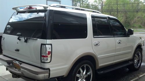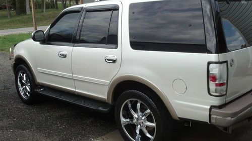 You are bidding on a 1999 Ford Expedition Eddie Bauer. Nice truck with little to no rust. Has leather interior,kenwood cd player with navigation and back up camera on rear view mirror. Truck has very little wear in the seats. No dents or scratches, has been painted recently. Average wear and tare. The antilock brake light is on and the air/heat act whacky sometimes when in the winter it doesn't get to warm. I have replaced the heater/ac control but that didn't fix it. I was told that this happens on these trucks and its something in the dash(damper) . It also could probably use a tune up, I cant remember the last time I did one. Overall a good truck for its mileage and age. sold as is no warranty. I have the right to end auction at any time.