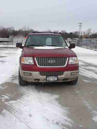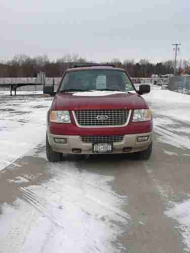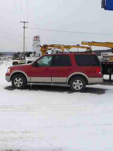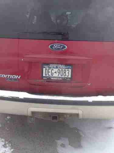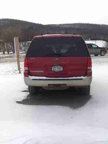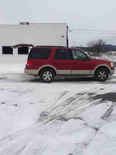 2005 Ford Expedition Eddie Bauer edition. Good condition, red with tan trim, side boards, keyless entry, beige interior, air, cd player, volume/temp/fan/cruise all controlled on steering wheel buttons, leather interior, automatic transmission, dual air/heat controls, back area heat controls and radio controls, 7 passenger seating, rear seats automatic fold buttons, middle seats are bucket seats and fold down and tilt forward, cup holders, inside switch for four wheel drive. 132,218 miles on it. It has been well loved and cared for. I changed the oil every 3000-5000 miles. It has been serviced on a regular routine. Bought from dealer as an executive owned vehicle in 2005. It needs the lift hatch and hood painted due to paint bubbling with wear. Not a priority because it is only in a couple of areas. Hope the pictures help to show this. Selling is bitter-sweet. I really love this SUV. Buyer must pick vehicle up in Oneonta, New York.