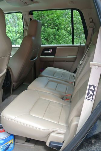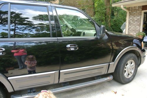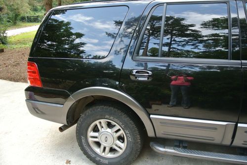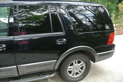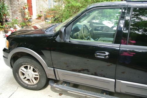 This listing is for a Black 2004 Ford Expedition in good used condition. There are a few scratches on the body. I tried to get photos of most of them. There are scuffs on the left and right side of the front bumper and a scratch on the driver's door. The body is in good condition. The windshield is cracked, but it is below the line of sight. The keypad entry has quit working. There are step sides on both sides of the vehicle. They are a little rusted but still sturdy. The interior is in excellent condition. The leather seats have been well cared for. The AC works but cuts in and out due to a faulty blend door. The rear AC works fine and there are no issues with the heat that we are aware of. The rear temp controls work fine. The CD player is a 6 disk player with AM/FM radio. There is also DVD player in the back with headphone jacks. The switch that controls the movements of the left third row seat has quit working, but the right works fine. It may just be a loose connection somewhere. The passenger side window motor is a little weak, but it still works. We are the second owners of the vehicle. We bought the vehicle directly from the owners and they told us that they bought it new.
