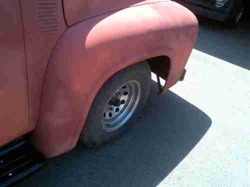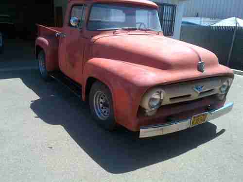 Very nice 56 Ford F-100 shortbed pickup. This rust free 100% stock truck has a stock 223 six cylinder (not running) and three speed transmission. Original VIN Tag and Title VIN match (see pics). It even has the original yellow and black "56" California License Plates! Has newly redone stock bench seat, new wheel cylinders and master cylinder (brakes work great). Has chrome bed strips and oak wood in bed (needs refinishing). All stock suspension and it steers very well. Has stock heater, wipers, turn signals and bumpers (they will need re-chroming). Has crack in windsheild and driver's side door glass. Very straight body and a great platform to build a very nice 56. Don't know much about the engine but it has the rare "glass bowl" carb. Will provide extra stock engine for parts. I reserve the right to end the auction early as the truck is also for sale locally. "BID TO OWN" Feel free to email or call Al at (559) 916-4604 for more info!