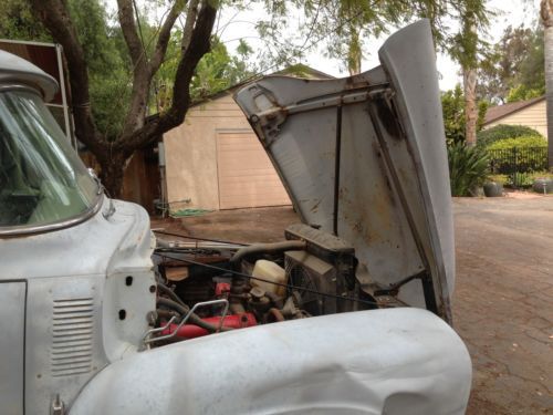Has California title registered through Jan 2015. Includes a new factory repair manual and truck cover. It has a 50's era V-8 Lincoln engine which was a sought after engine (Hot Rod Lincoln) at that time. The casting number on the intake manifold and block shows it is a ECU series. Whoever put this combination in was going to make a very cool rod. It currently doesn't run. The body is virtually rust free (some surface rust) with some bondo. VERY solid cab, doors, fenders, hood, frame. Looks like the cab floor has been sandblasted and painted. It has the original seat and gas tank. Front bumper is missing, though readily available, and the rear bumper was customized. The bed has been lined with aluminum panels. The transmission is a full synchro 4 speed with letters OD in the middle of the shifter knob which is very rare. May have come out of an F500, I've also been told it could be a Clark 5 speed made for big trucks. Clutch works and it does shift. The brakes feel like they still work. Lots of original parts still on the truck. The 8 lug rear end was on a F250 and the 5 lug front spindles where swapped and has disc brakes installed. Also installed is an auxiliary gas tank underneath the rear of the bed. It is a very sanitary installation. It looks like an installed option with a tank switch lever in the floor of the cab. Has most of the original dash parts and the cab is in good condition. The hood has been modified which for an original restoration would need to be changed back but for a rodder would be perfect in that it slides and tilts forward - no head banging. |