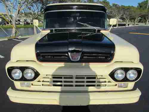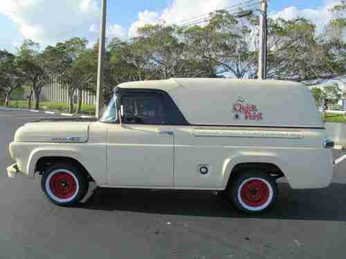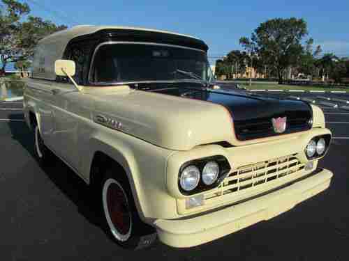 Up For Auction Is A Very Nice 1960 Ford F-100 Panel Truck. It Is Powered By A 302 V8 Motor & C4 Automatic Transmission. Motor Runs Great & Transmission Shifts Good. Motor Came Out Of A 70 Mustang, It Has A Mild Cam, Four Barrel Edelbrock Carb, Edelbrock Aluminum Performance Intake Manifold, Tall Chrome Valve Covers, Pancake Tall Chrome Aircleaner, 8MM Taylor Pro Spiro Wires, Chrome Fan Shroud, Performance Electronic Distributor, 110AMP ALT, Massive Radiator & Flex A Lite Fan. Truck Has Power Brakes, Hedman Headers, Performance Dual Exhaust System, Tips Out Of The Side. Interior Was Redone Not That Long Ago & Looks Great, It Has A Lokar Shifter, Aftermarket Gauges For Temp, Oil Pressure, & Voltage. All Lights Work Including Headlights, Turn Signals, & Brakes Lights. BEST Thing About This Truck Is The New Style R134A FREEZING ICE COLD A/C System That It Has. Decals On Side Promoting Business Can Be Easily Removed, I Can Do It For New Owner If So Desired. This Truck Is A One Of A Kind, Attention Getter & Conversation Starter For Sure. Garage Kept, Only Taken To Local Car Shows & Sunday Cruises. Clear Florida Title In Hand Ready For New Owner. Will Ship Worldwide (ANYWHERE) At Buyers Expense. If You Need A Shipping Quote Please Ask & I Will Provide One For You. Sold As Is. Located In Ft.Lauderdale Florida.