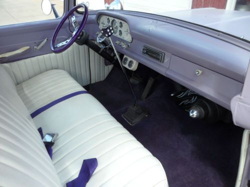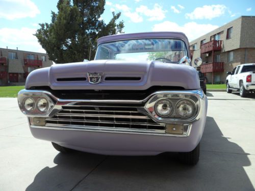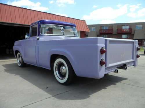 1960 ford f100 for sale. big back window. short bed. lots of custom. flat purple paint. gloss metal flake top. powdercoated wheels. coker wide white wall tires. custom pinstriping on tailgate and inside cab. 351 Cleveland with edelbrock intake, freshly rebuilt holley carb, ford motorsport valve covers, sanderson headers, msd pro billet distributor. flowmaster mufflers. don't know what the cam is but has a moderate lope to it. runs very nice. very reliable. c6 auto trans with floor shifter. about 12000 miles on motor and trans. interior is very nice. white vinyl bench seat and door panels. nice purple carpet. Mexican blanket headliner. new mooneyes tach, and new purple metal flake steering wheel. matches roof very well. body is very straight. California truck. no patch panels. 99% rust free. very bottom of passenger side cab corner is slowly starting to show a lil bit of rust. one small rust spot on edge of hood. (see pics). all emblems and trim are shaved except for front hood emblem. front and rear bumpers shaved off. louvered rear roll pan. custom four taillight setup, with taillights from a 1954 olds 98. shaved door handles with remote. the flat paint is a single stage and is starting to show some peel and fade in a few places on the hood and back of cab. I like it though. I think its a great look for the truck. its got 4 wheel manual drums and manual steering. solid axles and monoleaves. overall its a great cruiser though. very traditional. it gets a ton of looks. its not quite a show truck, not quite a rat rod. its just a cool old truck. really don't want to sell but im looking to buy a house so it needs to go. the truck is for sale locally as well as other sites so I reserve the right to end the auction early. buyer is responsible for pickup and/or shipping. any serious inquiries feel free to call me with questions at (308) 539 1792 anytime after 1pm us central time. $500 non refundable deposit needs to be made within 24 hours of sale and paid in full before taking possession within 7 days of sale. I can store truck indoors up to 30 days but the truck needs to be paid for and insured.