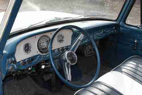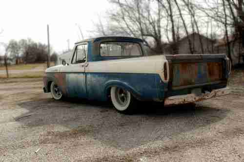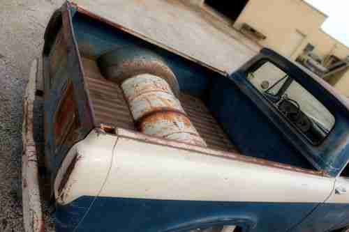 61 Ford unibody in nice shape...late 70's Volare 318 V8,auto trans,power steering,power brakes,tilt steering wheel,with Volare front clip...new brakes..disc in front drum in rear..new power booster...brakes have new rear drums and all new hydraulic parts except the brake lines..brakes work great!...new muffllers,, Magnaflows...sounds nice....throaty, not super loud...old school mags with wide white sidewalls, BF Goodrich tires....everything works except the speedo and E brake..even the heater /defroster work nicely....nice comfy seat with cool pinstripping on the dash...this truck is in good working order with no major defects...windshield does have a small crack but still passes safety inspection .,.starts right up every time, even in cold weather....also replaced the oil pump with a new heavy duty one, and replaced the timing chain at the same time....put in a new steering box, and replaced the pitman arm .....there is no rubbing in a hard turn on the front tires...the front has 2" drop spindles and adjustable tortion bars...the rear was lowered by "C" notching the frame and flipping the axle...the sawed in half 50 gal drum in the bed allows for suspension travel and covers the rear axle.....it has a great stance for not being bagged, and can run down the road just as she sits...theres a little rust on the interior steps, but is repairable,,some rust in the floor and bed was previously cut out and repaired...tailgate is original and works good....this truck gets plenty of attention and" thumbs up" while driving it...it can easily be used as a daily driver...I'm only selling it to help finance a home renovation...please ask any questions you might have...there is a reserve, but no "buy it now".....please dont ask the reserve,it wont be revealed....I reserve the right to end the auction early as it is for sale locally.....these unibody trucks were only made a few years and are drying up, especially in this shape...the body is sound enough to convert to nice paint if desired, but personally I like the look just as is!....Happy Bidding!!