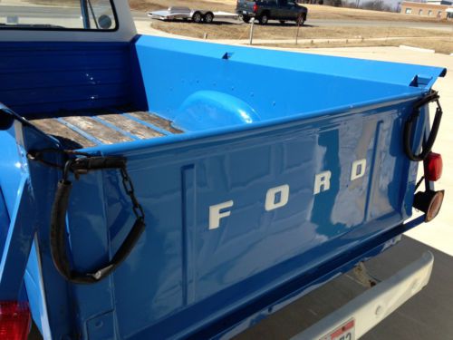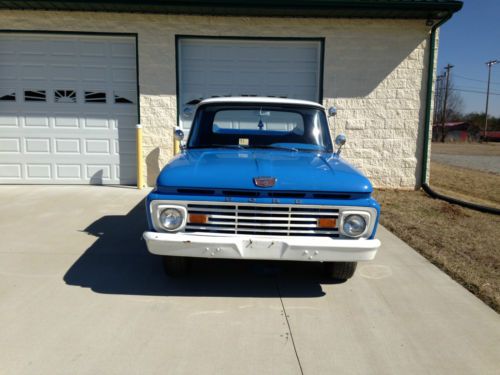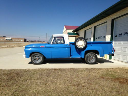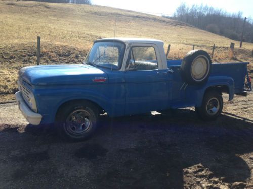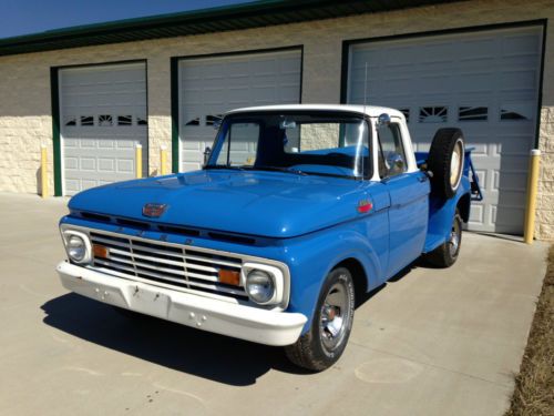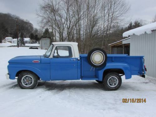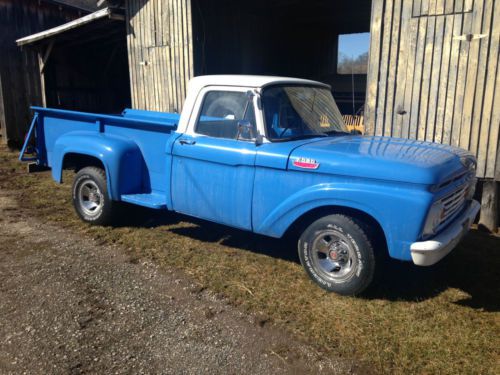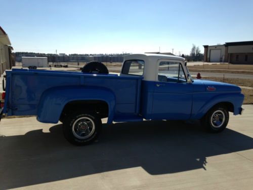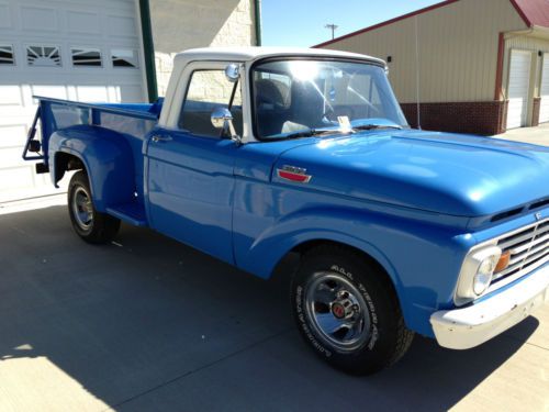 1963 Ford F100, 292 V8. 3 speed on the column. Nice truck with older resto, shows well still but it is driver quality not a show truck. Rare step side long bed with spare tire carrier. Body is in very good shape with no rust through or surface rust in outer panels, some interior panels has had some in the past. Everything works except the speedo and fuel gauge. This truck starts up like a new car, just hit the key and it fires off. Drives down the road and brakes well too. It is being sold as is no warranty, with the buyer responsible for shipping. The truck is listed locally and may be sold at anytime, so it you are interested let me know. The truck will not leave until payment has cleared. Thanks