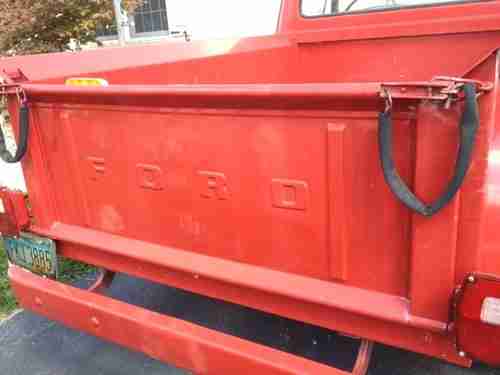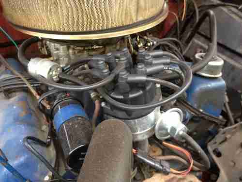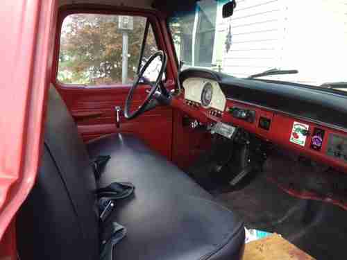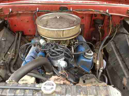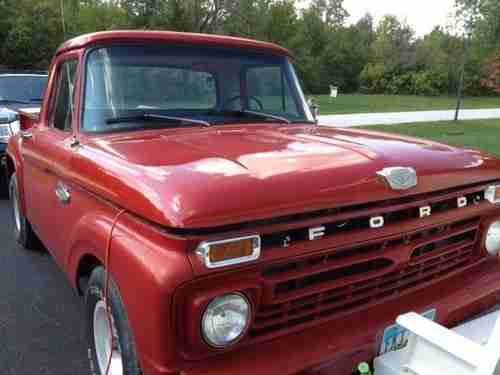 1966 Ford F100 unknown miles because it only has a five digit odometer. Has working heat. New HEI distributor, has 750 cfm Carter carburator, I have Holley 650 cfm carburator that can be installed. Body in good condition, one small dent the size of a quarter on cab just behind passenger side door, one rust spot on the driver's side of bed the size of a quarter and some light rust on tailgate, paint job would resolve all rust not rusted through no patch work needed. Runs but needs master cylinder rebuild or replacement. Brakes will engage is pressed hard but loses pressure as you hold the pedal. Just has a bad seal so replacing or rebuilding master cylinder would fix the problem. Wooden bed.