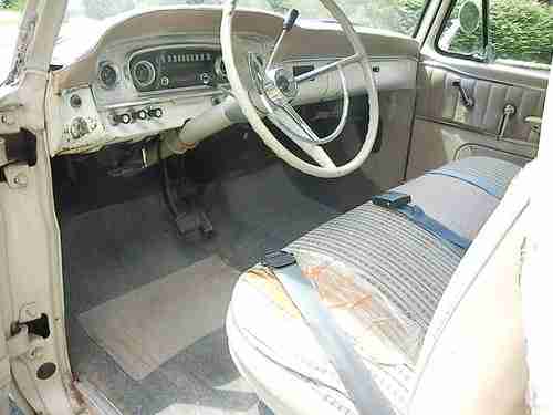 The floor mat and firewall cover are original and in good condition. The seat cushions seem fine, but the upholstery needs to be replaced and the correct fabric is available through SMS. The driver's side floor pan has several full thickness rust holes and although not a structural issue, should eventually be replaced. The sun visors are new reproduction and part of the headliner is missing.