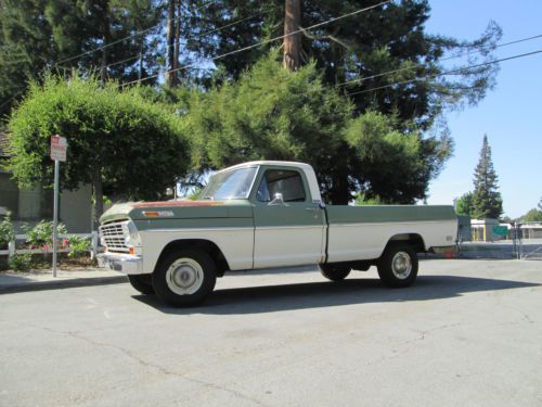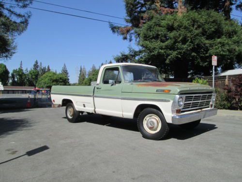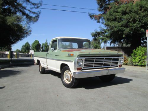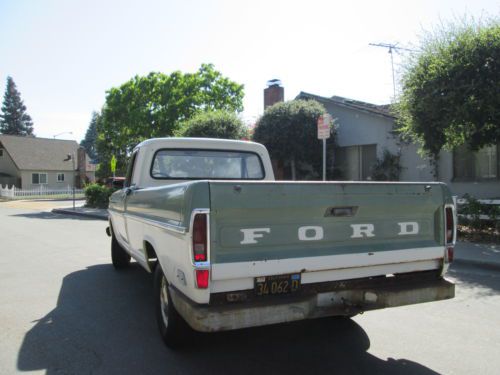Hi, up for auction is my 1969 Ford F-100 pick up truck. I purchased this truck form the original owner who, as you can see from the pics, babied this 'ol Ford truck its entire life. The truck has seen very light duty as the bed if the truck show very little wear. This F-100 spent it's life as a fishing and camping rig, and had a aluminum camper shell on it until I purchased it. The truck is in amazing condition, as runs as good as it looks!! I have been driving this truck daily! The truck has very low (undocumented miles) under 22,000 miles on the clock. Given the condition and history of the truck, I don't doubt these are true original miles. (The foot brake pedal pad has very little wear)360 cubic inch V-8 with factory automatic transmission, fresh complete brake job, the ol Ford stops on a dime! Original keys, everything works, with the exception of the horn, doors open and close like new, windows roll up and down with ease as well. Power steering and power brakes. This truck is a true California survivor in the literal sense. Interior is clean, original and sound, nothing cut or hacked, AM radio works well, and all dash lights and gauges work perfect.