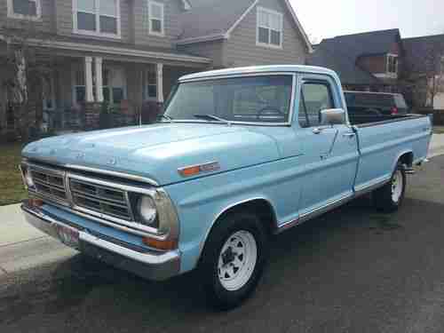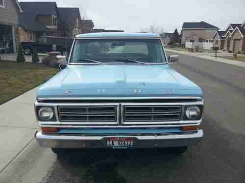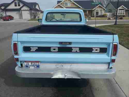 You are bidding on a 1972 Ford F-100 360. V8. It's automatic with power steering, new sound speaker on dash and AM/FM cassette radio. All original blue exterior with an 8 foot bed and a brand new black Linex bed liner. Has a slight dent on the left center of the hood and a small dent near the left rear tail light corner. NO RUST. California vehicle. New blue loop carpeting. No oil leads and does not burn oil. Very reliable truck. I am possibly the second owner. This truck was purchased in California. Cashiers check only. The buyer is responsible to arrange transportation of the truck. If you have any questions or concerns, feel free to send me a message and I will get back to you as soon as possible. Thank you.