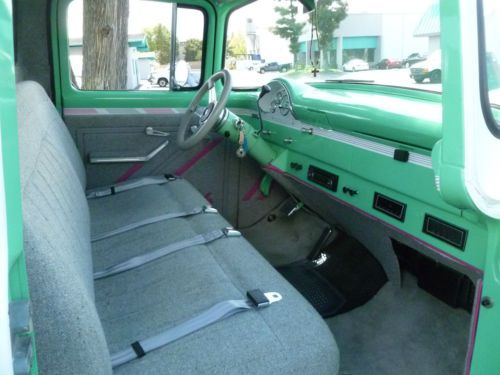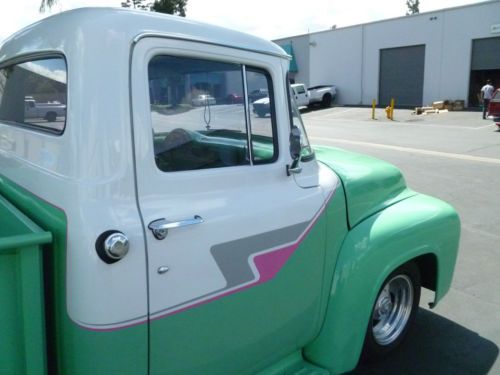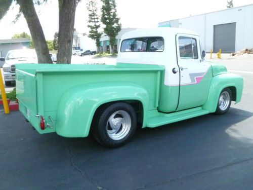 1956 Ford F-100 Built by Streetmetal Fabrication, Don Jacks Shortly after being built, this Truck was featured on the cover of "TRUCKIN" Magazine. The Truck was also recently in Southern Rodder Magazine. The Truck won "Best of Show Top 50" at the 2004 F-100 Super Nationals in Knoxville. SUSPENSION: 1956 Ford F-100 Frame GM Front Clip (Chevelle) Power Steering, (S-10) Pump with remote billet tank Power Front Disc brakes and drum rear brakes Reserved eye parallel leaf springs GM 10 Bolt rear end, 3:08 gear Billet Specialties Alum. Wheels 15 inch, Hoosier Tires ENGINE: 350 Chevy Crate Motor, 4 Bolt main truck Motor Eldebrock intake and 600 cfm carb. Mallory Dist. (Unilight Electronic) Taylor 8mm wires Zoops Billet alum. ball milled breather, valve covers, wire looms, air, alternator brackets and pulleys Sanderson coated heathers Sanden 508 air compressor 100 amp. Alternator Griffin Alum. Radiator Transmission: GM 350 Automatic, Rebuilt BODY: Cab stock rust free 1956 Ford Bed is Dennis Carpenter repro with new smooth tailgate, rolled pan. Steel stock rear fenders Steel stock hood Glass front fenders and inner fenders Stock steel running boards Stock painted grille, trim, and amber parking lights and/or New reproduction triple chrome grille, trim and clear lens parking lights (currently installed) Custom chrome and "Ford" script taillights Paint by Don Jacks PPG Mint Green and White two-tone paint with Pink and Gray custom accent striping Freshly refinished oak boards in bed with polished stainless steel strips New polished stainless steel windshield wipers INTERIOR: Chevy Truck bench seat (1992) Matching interior in Gray by John Addis VDO Electric Gauges Ron Francis Wiring Harness New Vintage Air Heat/AC (in dash installation) GM tilt, shifter, steering columm with key New interior accents by Radical Changes Charcol gray carpeted floors New custom embroidered, color coordinated carpet floor mats Sony AM/FM Stereo Radio w/cassette player (speakers concealed under seat) Lacarra leather wrapped, polished stainless steel "Ford" steering wheel New black seat belts. Any Questions Contact: Carlos 951-640-4620