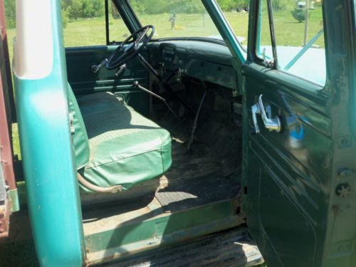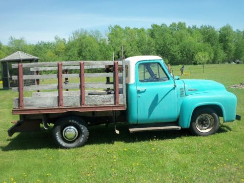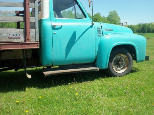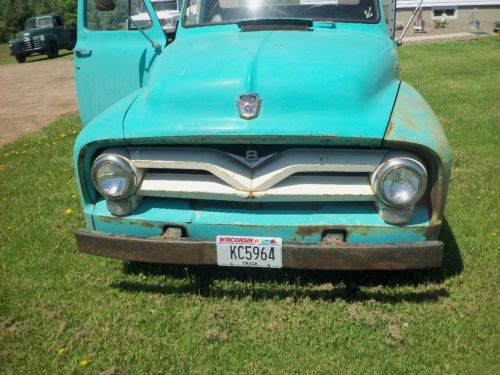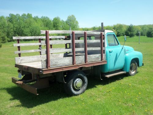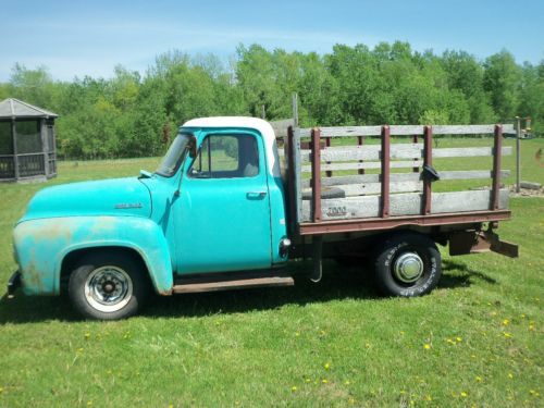 This is a nice 1955 Ford F250 V8 Stake Bed Truck. Better than average condition normally seen, especially in this neck of the woods. Truck is in original condition, has not been redone. Was used as a farm truck for most of it's life. First in Wisconsin, then in Minnesota until about 1977. Originally came with a 239 V8, which put out about 113 HP, but owner in Minnesota ran it out of oil and replaced it with a 59-60 292 V8, which was a nice upgrade because it put out about 193 HP. Engine runs great. Always starts, even in below zero temperatures. Truck has been used at least weekly on short trips to neighbors since I've had it, which is over a year. Prior to that is was stored in a pole shed for about 30 years. Last year it was registered prior to me was 1977. Drives fine. Has four speed manual transmission with granny. Clutch works fine. Has manual steering. Has manual brakes that work, but should be upgraded if to be used on longer trips. Heater and defrost seem to work. All gauges work except fuel and temp. Tires are pretty good. All glass is good, except drivers door window is cracked. Body is not bad. A few rust spots in the corners, but looks good. Frame is also in good shape. Floor is in decent shape. Original mats are still there. Interior isn't bad either. Dash and doors look good. Seat is a little worn on drivers side back. Was stored in pole building most of it's life. Hood is nice. Has the F100 emblems on the hood for some reason unknown to me. Original metal identification plate in glove box. Has 12 volt electrical system. All lights, horn and blinkers work. Has 43320 original miles and odometer does work. Have clear title and is currently registered/licensed. Identification plate says it is a F250 3/4T made in Dallas, Texas, 6900 GVWR, 118" wheel base, 4.86 differential. Would make a fun driver the way it is, or a nice base to start with on a restore. See pictures for best description. Contact me with questions of if more pictures are needed. Will assist in loading. Can be driven on to trailer. Delivery is a possible option depending on distance. Can be discussed with buyer. Accepted offers, over my starting price, is always possible, using the "buy it now" option, as long as no bids have been placed.