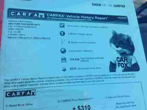 2002 Ford F250 Lariat 4X4 Crewcab 7.3L Turbo Diesel - This truck is loaded with options such as: Warn front hub locks, Heated-Leather seats, all power options, 4WD, towing package, and bedliner. This is a one owner, non smoker vehicle and it has been very well maintained, it even comes with the original window sticker.This truck runs perfect hot or cold! It fires right up every time with ABSOLUTELY NO SMOKE! We have a CarFax report on this truck showing No Accidents and One Owner. You can drive this truck across country the way it sits Right Now! With only 134k miles on a 7.3L diesel, this truck will last for many years to come. If you have any questions regarding this truck please give us a call.